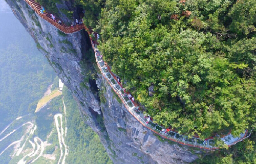 2016年8月1日,湖南省张家界市天门山风景区第三条玻璃栈道——盘龙崖玻璃栈道开通迎客,该栈道全长100米、宽1.6米,因站在玻璃栈道上能俯瞰整个天门山99道弯盘山公路而得名“盘龙崖玻璃栈道”,该栈道以其绝壁凌空的恢弘气势和令人头晕目眩的视觉感受令人胆战心惊,备受游客青睐。