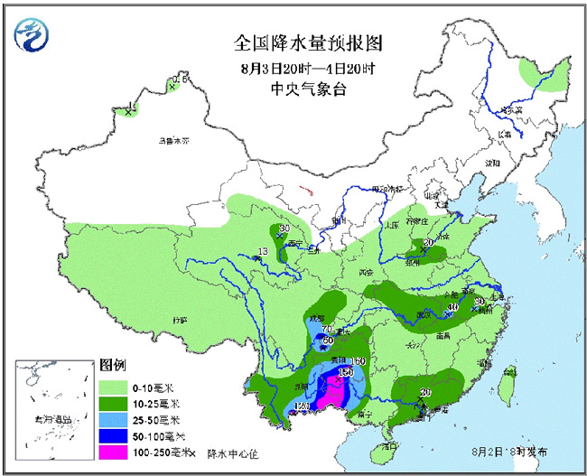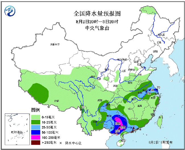 2日20时至3日20时,广东西部、广西、湖南西南部、贵州大部、四川盆地南部等地有大雨或暴雨,其中,广西中部和南部沿海、贵州东南部等地的部分地区有大暴雨,广西中部局地有特大暴雨(250~300毫米,见图3)