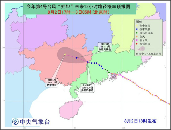 图2 “妮妲”路径概率预报图(8月2日17时—3日05时)