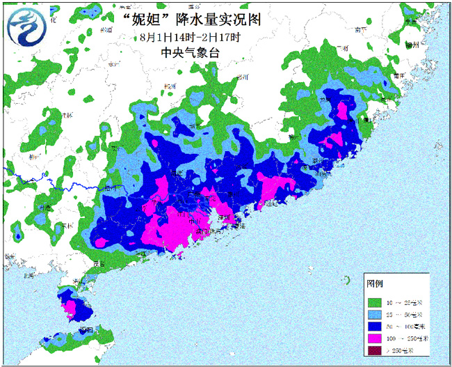 图1 “妮妲”降水量实况图(8月1日14时—2日17时)