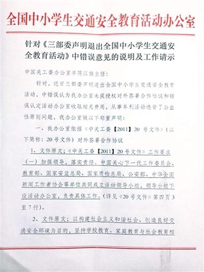 这份声明中写道:最近,教育部、国家质量监督检验检疫总局、国家安全生产监督管理总局发表声明,退出全国中小学生交通安全教育活动,我们完全赞成。交通安全教育活动在开展过程中,确有人未经领导小组同意,以全国中小学生交通安全教育活动办公室名义与社会公司签署合作协议,收取相关费用并产生民事纠纷。为此,领导小组成员单位曾多次研究处理,并于2014年7月召开会议决定停止这项活动。会后,中国关工委立即收回公章并责成活动办公室处理遗留问题。据了解,此后这项活动未再继续开展。目前,还有些遗留问题正在处理中。