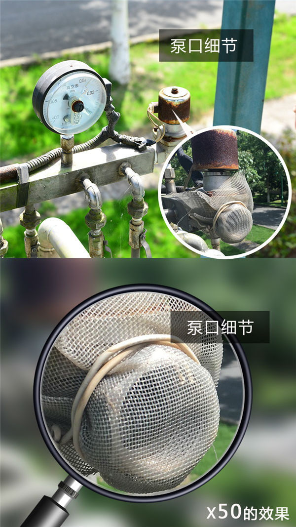 水体里沉淀的杂质变成污泥吸附在池底,为了保持水体洁净,沉淀池选用了虹吸式吸泥机进行排污泥处理。吸泥机主要由泵和吸泥嘴、吸泥管组成。吸入管内的污泥经水泵出水管输出池外。当虹吸处理器开启时,机器泵口经常会有迷路的小昆虫被吸入,吸附在管道内降低了吸泥的效率。当蒋站长发现这个问题后,就自己在泵口包了一块纱布,既保护了小昆虫的生命,又延长了吸泥机的寿命。