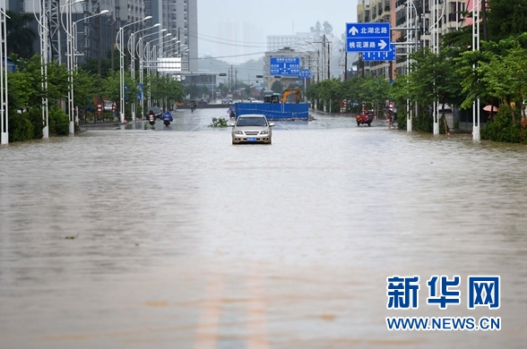 8月4日,南宁市安园东路被积水淹没,一度中断。台风“妮妲”已经远去,但残留低压环流仍给广西带来影响,广西多地遭遇暴雨袭击。 新华社记者 周华 摄