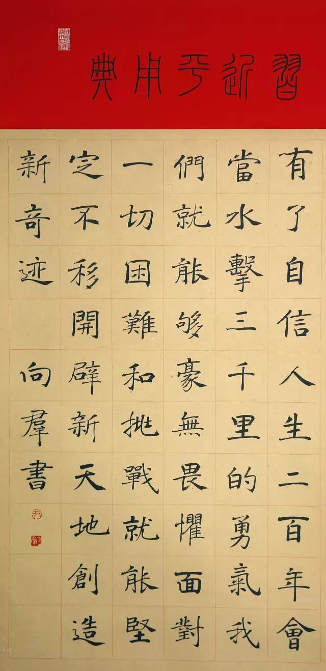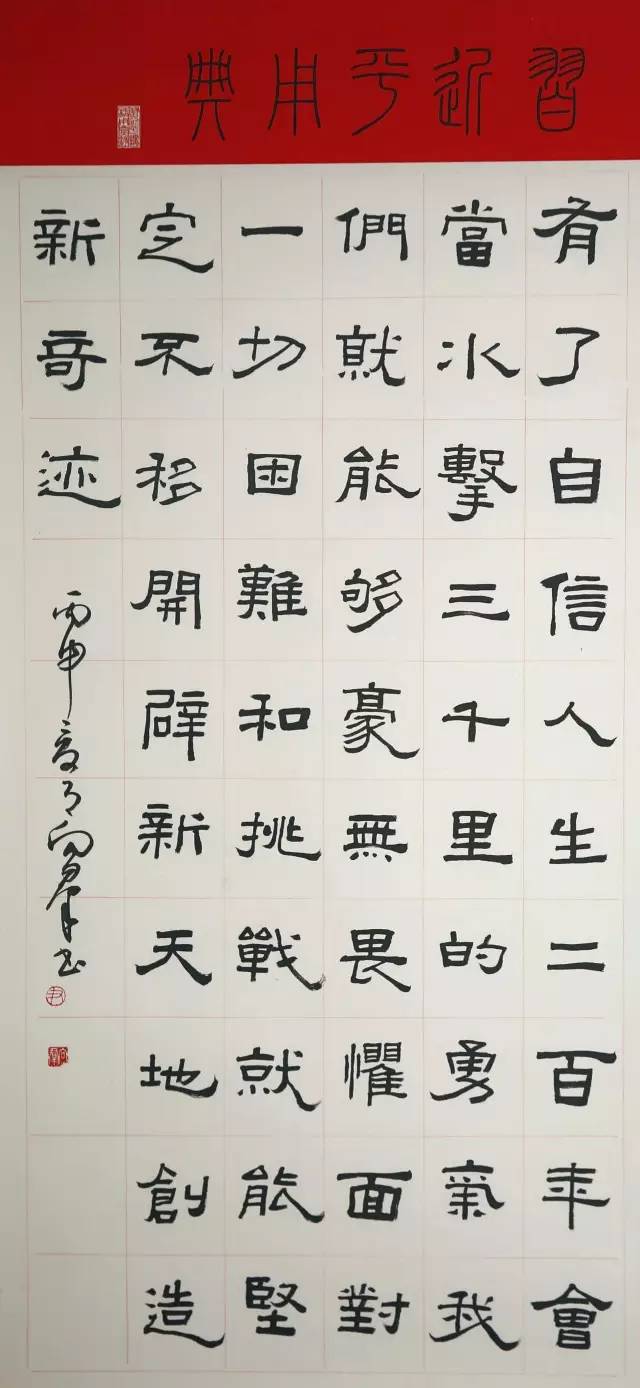 在“两学一做”活动中,知名青年书法家尹向群将习近平总书记系列讲话中的经典语言、典故,用不同的书法形势展现出来,让大家充分体会中华文化的精髓和中国书法的神韵。