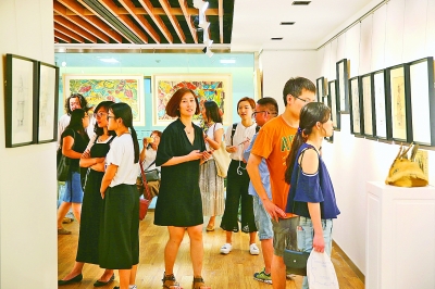 8月6日,观众在北京新闻大厦欣赏“像外像在北方——顾桃绘画展”。该展览汇集了纪录片导演顾桃以北方少数民族为主题创作的素描、油画等作品50余幅。