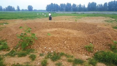 在周口港口物流产业集聚区(简称“周口港区”)一条新修的名为“巴铁大道”的公路一侧,被白色围墙圈起的数百亩土地荒草丛生,草丛内零星散落着石块,有人赶着羊群在围墙内吃草。在没有荒草的中间区域,赫然出现一个新挖的直径约10米的大坑,几个孩童在爬上爬下。