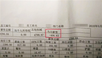 杨女士告诉记者,她对负数薪酬单感到不解,她说,按照北京市人力资源和社会保障局的通知规定,企业和事业单位的最低工资不得低于1720元,而她的工资不仅低于最低工资,而且还是负数。