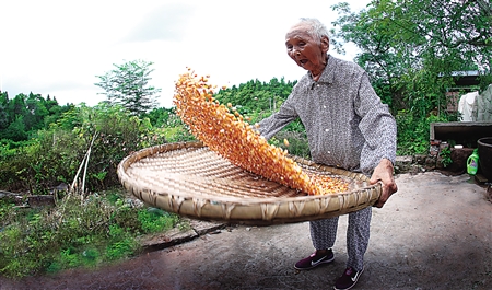 昨天,潼南区毗卢村6社,109岁的郑世祥端着大簸箕玉米扬尘,动作娴熟又轻松。 本组图片由首席记者钟志兵摄