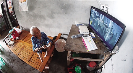 婆婆屈膝坐在凉床上,电视里战火纷飞,看着屏幕她眼睛都不眨一下,不时喃喃自语,偶尔摇动着手中的蒲扇。