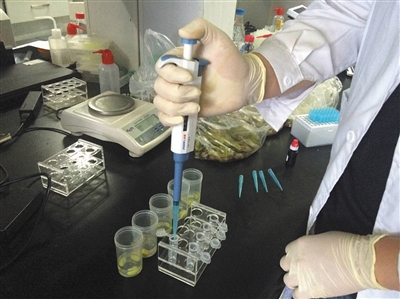 将样品去壳后取2至3粒放在10ml蒸馏水中浸泡10分钟。