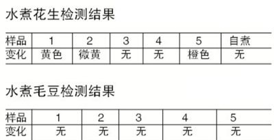 1分钟左右,水煮花生的1号和5号样品溶液变成橙黄色,其中5号样品颜色呈明显的橙色,1号样品颜色较浅。2号样品的溶液颜色也呈现出微弱的黄色,但相比于1号和5号浅很多。而5份水煮毛豆样品溶液无变化。具体结果见下表: