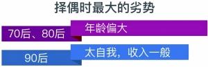 当问及脱单劣势时,却呈现代际差别,近五成的“70后”和“80后”表示年龄偏大是“脱单”过程中最大的障碍。而对于“90后”来说,“太自我,不懂取悦对方”(42.41%)和“收入一般”(40%)让他们感到“压力山大”。