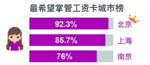 而面对伴侣财产,北京女性表示希望伴侣将财产交给自己保管的比例最高,达92.3%,表现出较强的“掌权欲”,而一向被认为相对强势的上海女性也有85.7%希望伴侣“上缴”工资卡,排名第三的是南京,比例达76%。