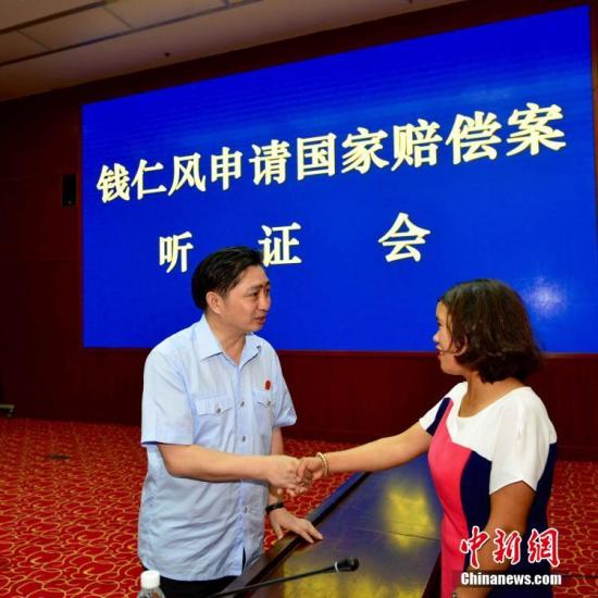 资料图 7月8日下午,云南省高级人民法院副院长、国家赔偿委员会主任田成有与钱仁风握手致意。中新社发 赵赢 摄
