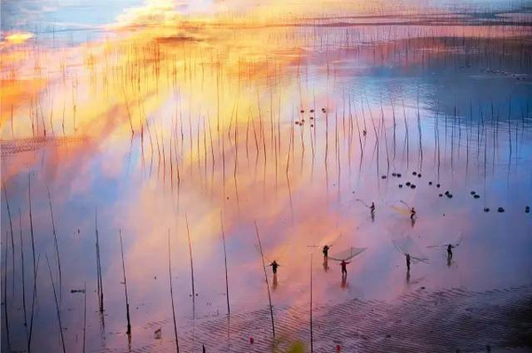 四季潮汐、天光云影,诡谲神秘的满海竿影、梦幻般的海上家园,鸥鸟掠过的金色沙滩褐色礁丛,海上远空中的日落余晖……这就是梦幻般的福建霞浦。