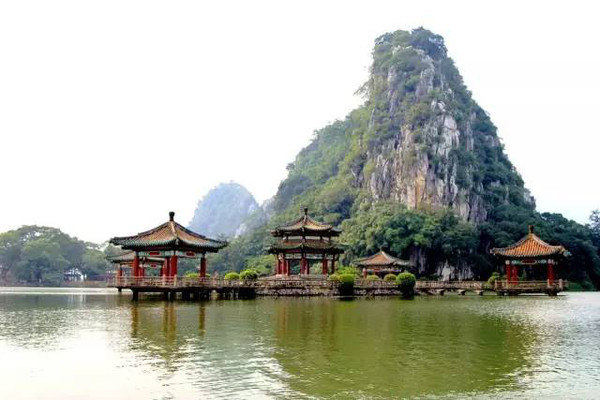 七座排列如北斗七星的石灰岩岩峰巧布在面积达6.3平方公里的湖面上,20余公里长的湖堤把湖面分割成五大湖,风光旖旎。被誉为"人间仙境"、"岭南第一奇观"。
