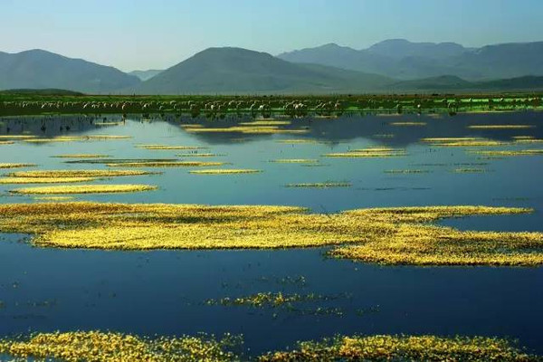 每到6月中旬,在绿江村沿鸭绿江的水没地上,大面积的黄色花海在青山绿水的映衬下显得格外美丽。