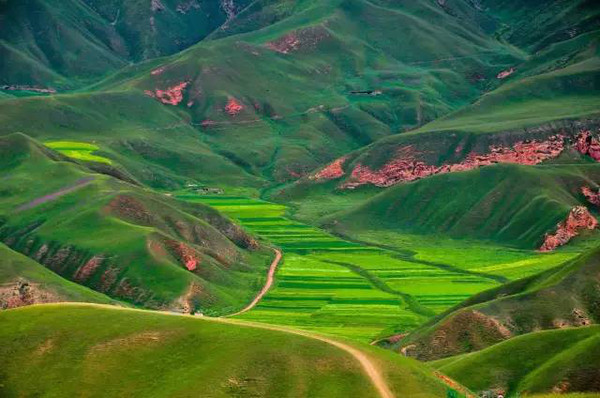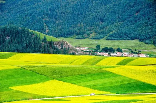 云雾缥缈缭绕,田畴里黄色的色块、绿色的色块搭配偶尔袒露的红色丹霞色块,与远处的雪山相辉映,清新脱俗得美丽着。