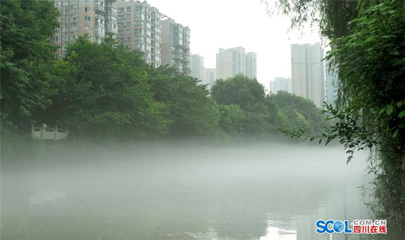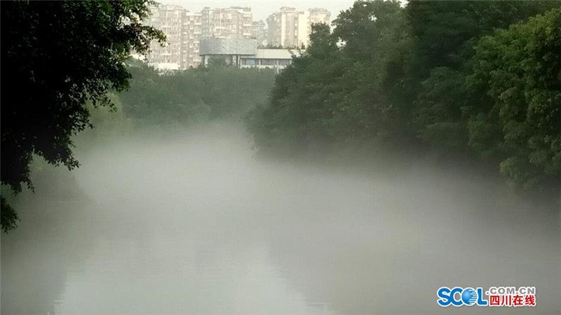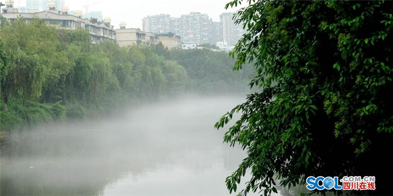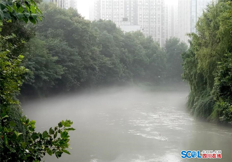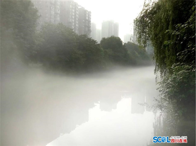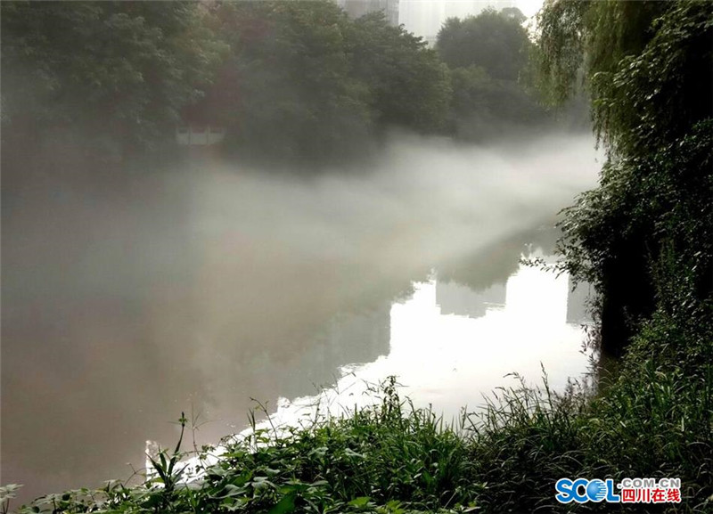 8月9日早晨7点30-9点30分,立秋后的首场雾霁降临成都沙河,在曲水路旁的一段千米河道上,薄薄的云雾绕着弯曲的河流静静地飘逸在水面上,给沙河披上了一层神秘的面纱,让人置身仙境般的感觉。(记者 吴传明 摄影报道)