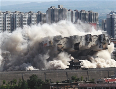 8月8日,山西大同,当地政府对位于北城墙武定西门外的一座90米高的大楼实施爆破拆除,飞扬的尘土与古城墙呼应形成壮观场面。