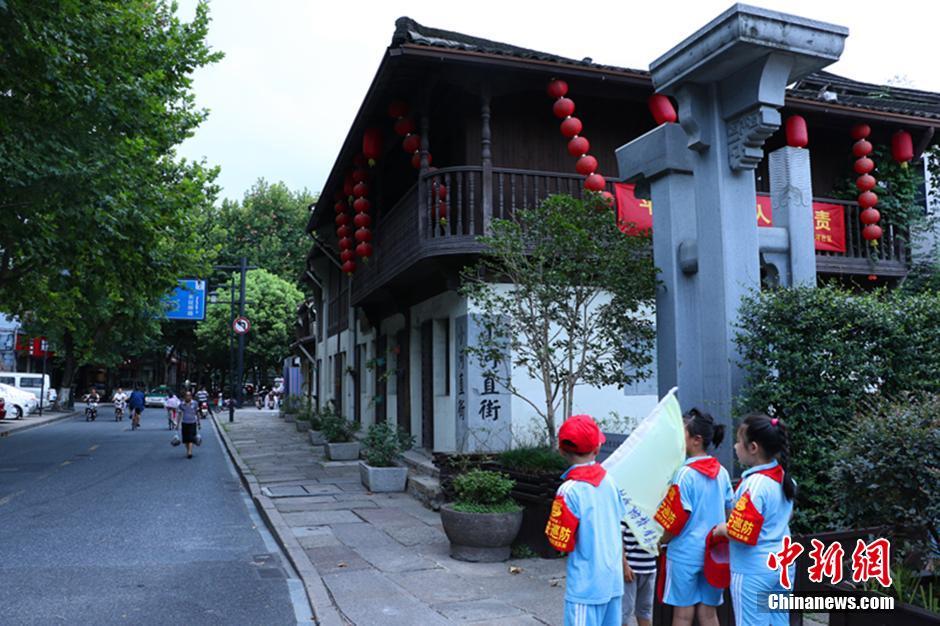 8月10日,三名小志愿者在浙江杭州小河直街入口。杭州小河直街历史文化街区地处京杭大运河、小河、余杭塘河三河交汇处。G20杭州峰会召开在即,小河直街也来了一次华丽“变身”成为花园街。 中新社记者 章天启 摄