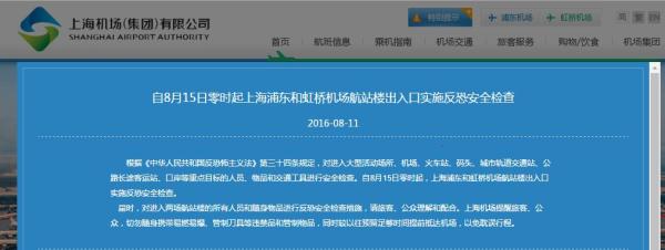 自8月15日零时起,上海浦东机场和虹桥机场将在航站楼出入口对进入人员和随身物品进行反恐安全检查。8月11日上午10时30分左右,上海机场集团发布公告称,自8月15日零时起,上海浦东机场和虹桥机场将在航站楼出入口对进入人员和随身物品进行反恐安全检查。