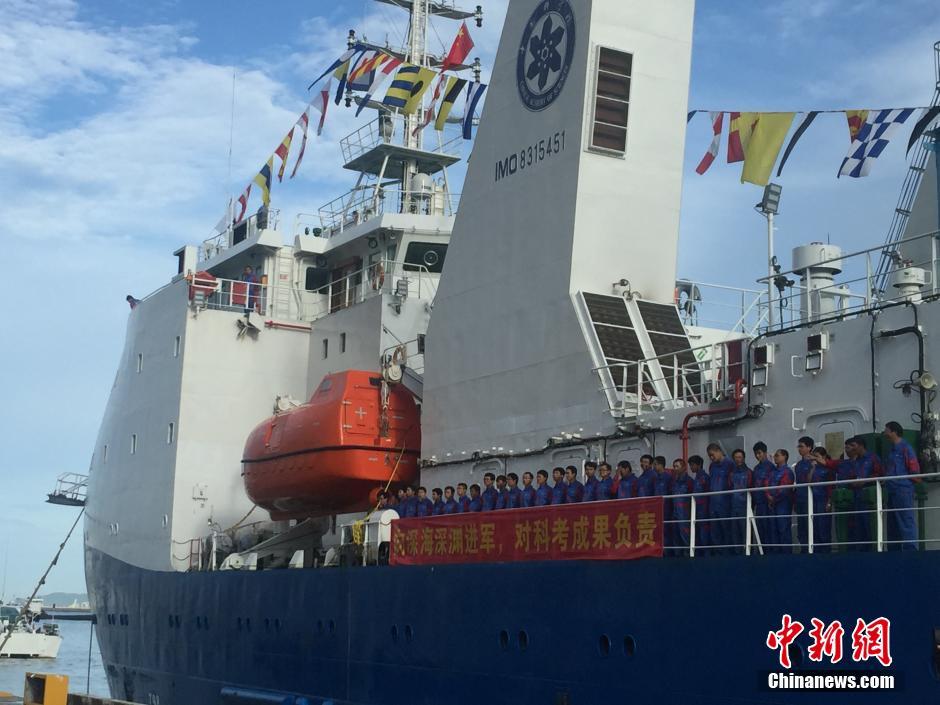 8月12日上午8点,中国4500米载人潜水器及万米深潜作业的工作母船“探索一号”科考船于三亚码头首航归来。中新社记者 董子畅 摄