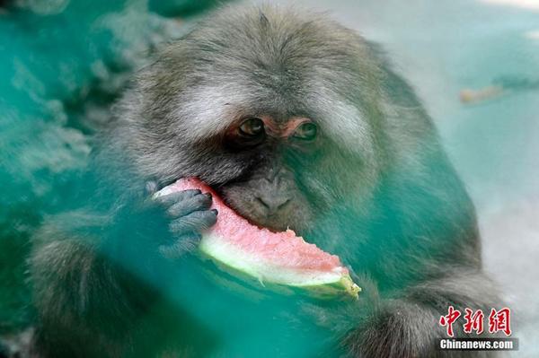 12日,山西太原出现高温,局地超37℃,动物园中的猴子吃西瓜降温。(来源:中新网)