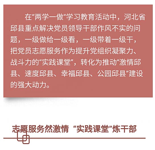 干在群众身边。邱县实行县委常委包乡镇、县级干部包村,四套班子领导既当指挥员,又当战斗员,拆旧房、平庭院、砌胡同,与群众并着膀子干。县委建立了县乡村三级志愿服务平台,推出“组织制单、单位领单、党员接单”的志愿服务“订单认领”模式和工作实绩考评排队制度,乡镇、街道和县直单位的党员干部,积极认领任务,每天早上六点钟到村义务劳动。