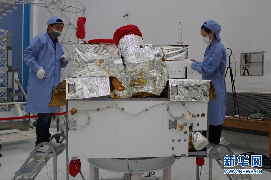 在酒泉卫星发射中心,量子科学实验卫星在安装外表面热控材料(2016年7月26日摄)。新华社发(中科院微小卫星创新研究院供图)