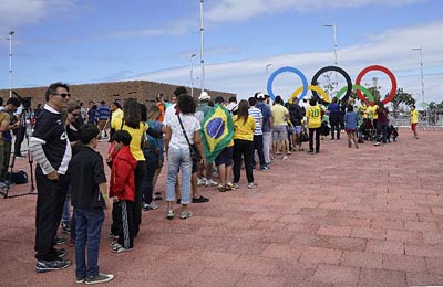 由于里约热内卢忽然挂起大风,悬挂在巴哈奥林匹克公园上空的摄像机15日下午被吹落。据里约奥组委确认,已经造成至少7人受伤,其中包括一名11岁的儿童,但并未有人伤势严重。据悉,在摄像机完全掉下前,奥林匹克公园内的部分地区已经被疏散,因为此前已经有一根钢缆断裂。图为8月11日,在里约热内卢奥运会主要场馆区域的巴哈奥林匹克公园内,人们排队等待在奥运五环前留影。在奥林匹克公园内,奥运五环和里约奥运会的会徽雕像是人们最集中的拍照留影地点。