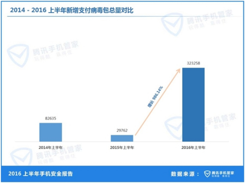 上述由腾讯安全实验室发布的报告称,2016年上半年新增Android病毒包918.25万个,同比增长53.90%,是2014年全年新增病毒包(100.33万个)的9.15倍。其中,新增支付病毒包32.33万个,同比增长986.14%,支付病毒形式严峻。