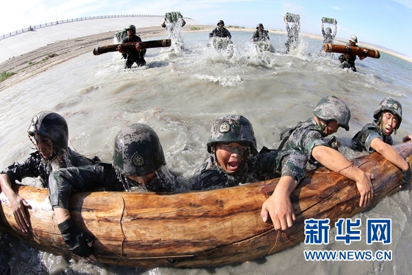 新疆军区某步兵师官兵进行水中托举圆木训练(2014年9月9日摄)。新华社发(刘永 摄)