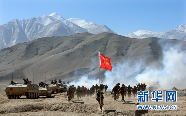 新疆军区某步兵师官兵在海拔5100米的喀喇昆仑高原进行兵种协同演练(2015年10月10日摄)。新华社发(刘永 摄)
