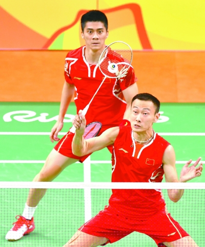 8月16日,傅海峰和张楠(前)在比赛中。当日,在里约奥运会羽毛球男子双打半决赛中,中国组合以2比0战胜英国选手,晋级决赛。