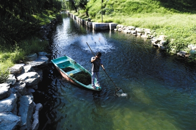 8月16日,圆明园,工人在河道内清理水草。近日,廓然大公水体已经修复完毕。新京报记者 浦峰 摄