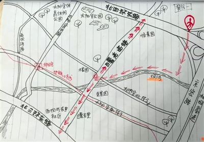 昨(16)日,窦立国告诉记者,他曾经做了10年快递员,自己对望京、三元桥等地道路非常了解,对于道路每天的通行状况以及周边可以绕行的线路都非常熟悉,于是就动手绘制避堵地图,目的就是让大家每天走在这些路上的时候,能绕开节省时间。