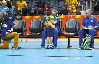 巴西女排主教练吉马良斯的孙子赛后安慰爷爷。