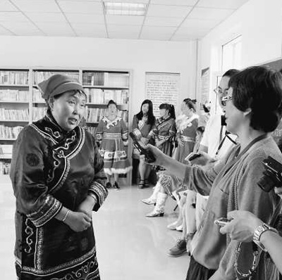 赫哲族大妈接受两岸记者的采访。