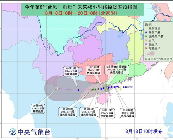 何立富: 今年第8号台风“电母”(热带风暴级)的中心18日上午10点钟处于广东湛江东偏南方大约130公里的南海西北部海面上,就是北纬21.0度、东经111.6度,中心附近最大风力有8级(18米/秒),中心最低气压为985百帕,7级风圈半径70~150公里。预计,“电母”将以每小时15公里左右的速度向偏西方向移动,将于18日傍晚前后登陆广东雷州半岛(20~23米/秒,8~9级,热带风暴级),18日晚上移入北部湾,强度将进一步加强,最强可达强热带风暴级(25~30米/秒,10~11级),19日下午将在越南北部沿海再次登陆,之后强度逐渐减弱。