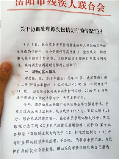 岳阳市残联提供的一份情况汇报中称,希望当地政府“责成云溪区人力资源和社会保障局录用谭劲松,并适当修改各类招考残疾人体检要求,从机制、体制上解决残疾人就业和对残疾人就业不公的问题”。