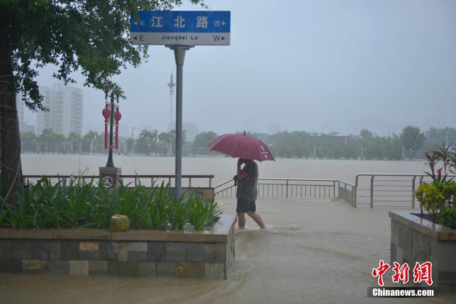 8月18日,2016年第8号台风“电母”给海南带来强暴雨天气,致海南省多市县出现严重内涝。在海南西部的临高县大部分道路积水严重,车辆无法通行,穿县城而过的文澜江滚滚洪水漫过江堤,低洼路段已被洪水吞没。图为海南省临高县市民冒险在洪水淹没的江北路行走。 中新社记者 骆云飞 摄