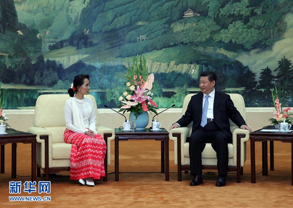 2016年8月19日,国家主席习近平在北京钓鱼台国宾馆会见缅甸国务资政昂山素季。 新华社记者 饶爱民 摄