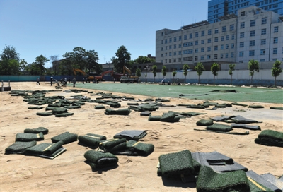6月23日晚,北京市平谷区第六小学操场拆除工作开始进行,包括操场的塑胶草皮及塑胶草皮下的水泥地面都将全部铲除。新华社发
