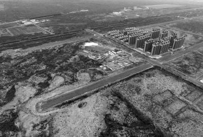 8月11日中午,记者从榆林市南部的榆阳区出发,沿宽阔的公路向西行驶约8公里,进而向南13公里,一片高层居民小区赫然出现在被低矮耐旱植物覆盖的广袤沙漠中。环顾四周,目光所及之处,除了偶尔呼啸而过的汽车,只有斑驳的黄色与绿色,楼群仿佛汪洋中的孤岛,沉寂而突兀。