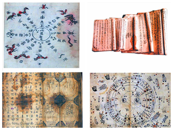 水书文字主要记录在水书卷本中,由民间水书先生用竹签、毛笔抄录在夹纸上装订成册,目前留存的手抄水书大多是明代以后的版本,来自多家水书先生传抄誊写。
