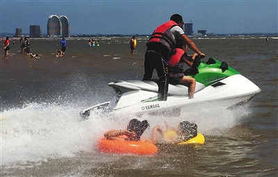 8月20日,东戴河止锚湾,男子开着摩托艇带一名小游客游玩,从一对母女身边极速开过。