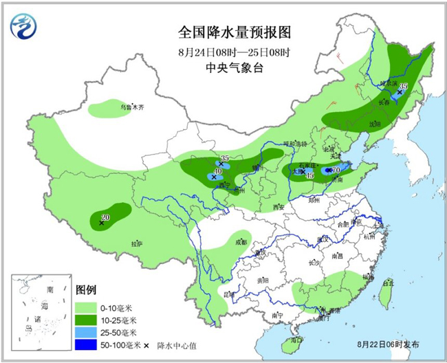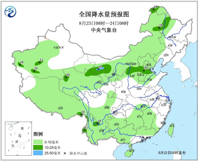 8月22日至23日,受低层切变系统影响,内蒙古中西部、西北地区北部、华北北部等地有一次中雨天气过程,局地有大到暴雨。另外,江南中南部、华南、云南等地有分散性中到大雨,局地有暴雨;上述局部地区并伴有雷暴大风、短时强降水等强对流天气,小时雨强20~50毫米。