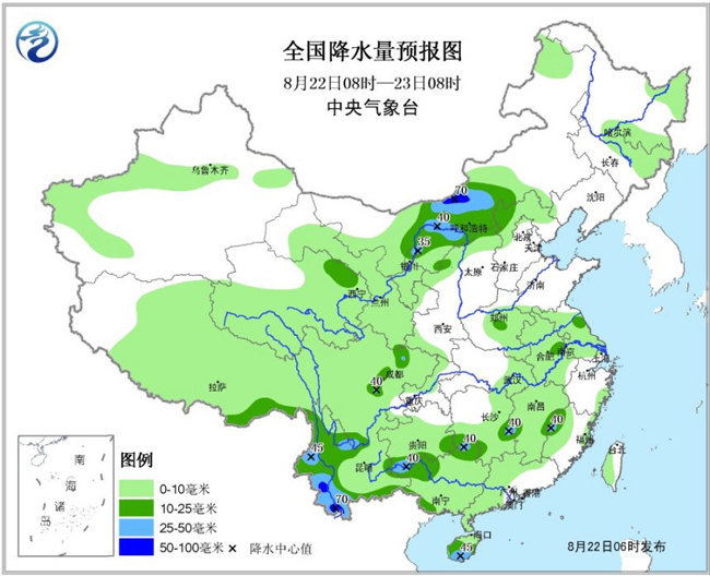 22日08时至23日08时,内蒙古中部、西北地区东部、华北西北部、云南中西部、四川盆地西部、江南中南部、广西西部、海南岛等地的部分地区有中到大雨,其中,内蒙古中部偏北地区、云南西南部等地局地有暴雨(50~70毫米);上述局地并伴有短时强降水、雷暴大风等强对流天气。