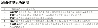 《办法》提到,城市管理的执法范围主要涉及住建、环保、工商、交通、水务、食药6个领域。